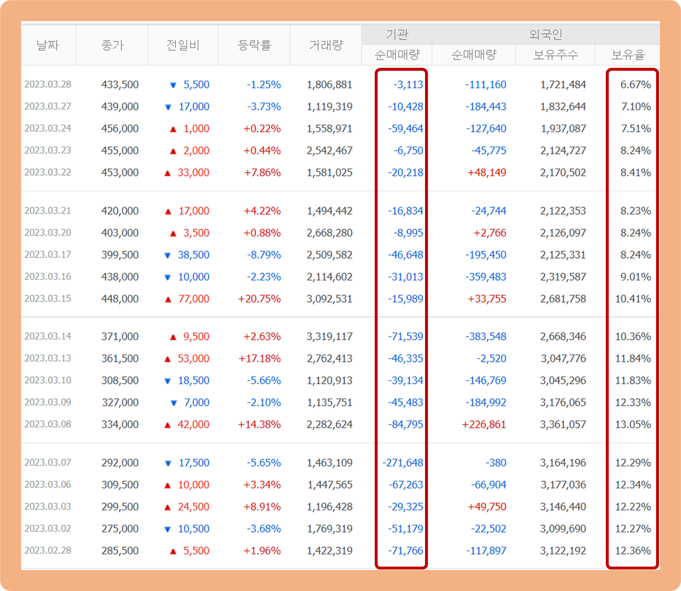 에코프로 주가, 기관 투자자 및 외국인 주식 거래 추이
