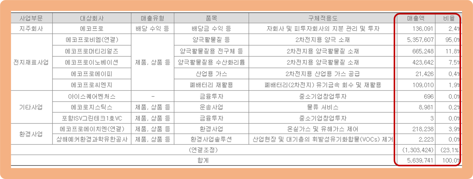 우선 에코프로비엠(연결) 부문이 약 95.0% 수준으로 가장 많은 비중을 차지하고 있구요.