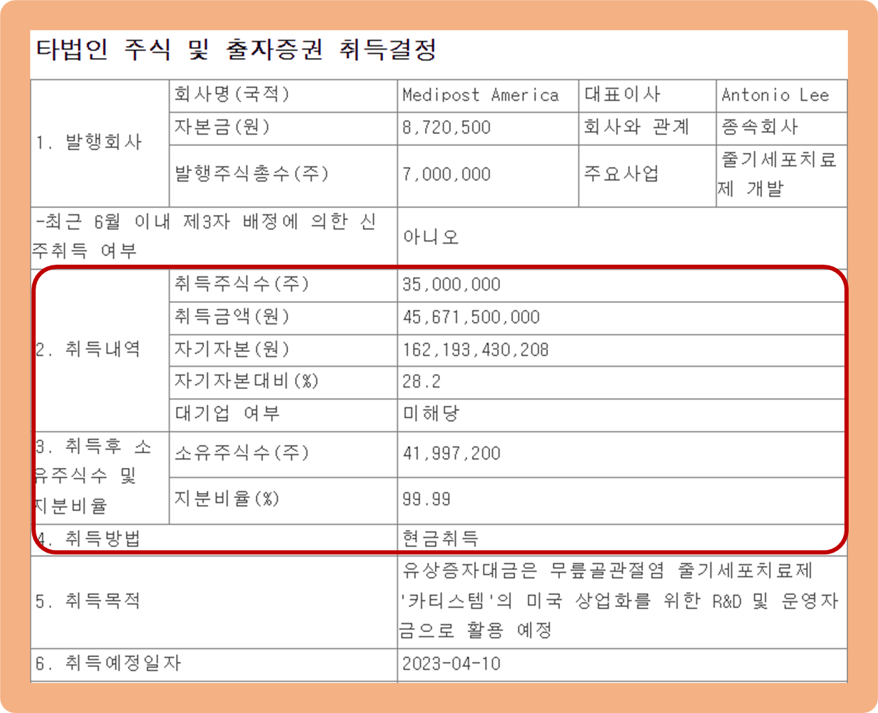2023년 3월 15일, 당사가 종속기업인 메디포스트 아메리카의 주식 3,500만주를 약 457억원에 추가 취득하기로 결정했다는 공시를 발표했습니다.