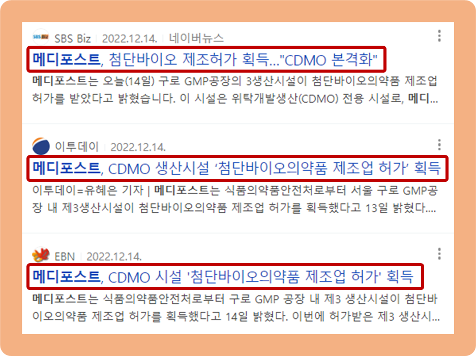 우선 지난 2022년 12월 14일, 메디포스트가 식약처로부터 구로 공장 제3 생산시설에 관해 첨단바이오의약품 제조업 허가를 받았습니다.