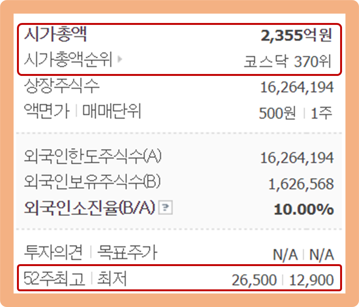 52주 최고가는 26,500원이며, 52주 최저가는 12,900원이네요.
