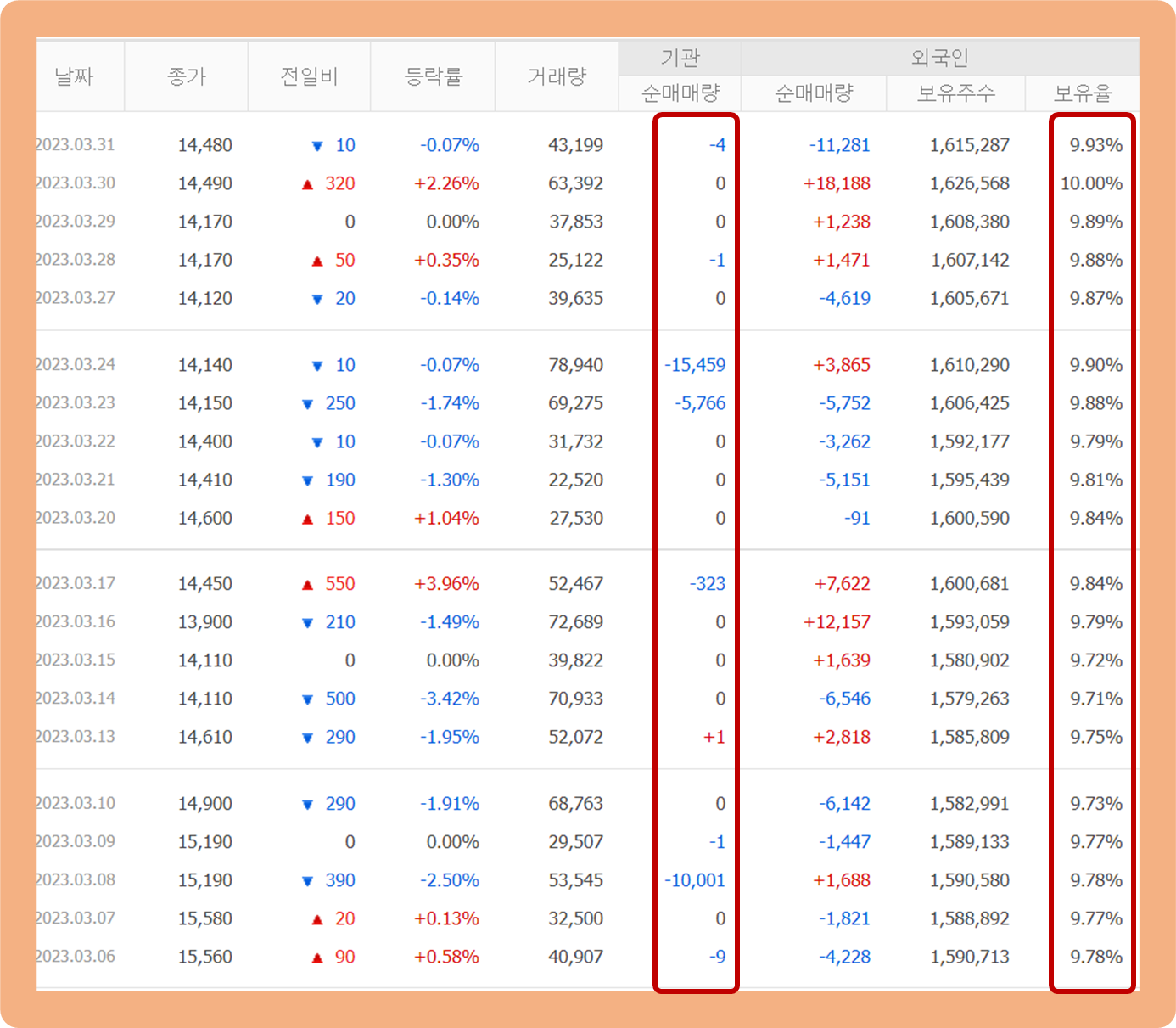 우선 기관투자자의 경우 지난 한 달 간 거래량 자체가 거의 발생하지 않았으며, 매도세가 우위를 점하고 있구요.