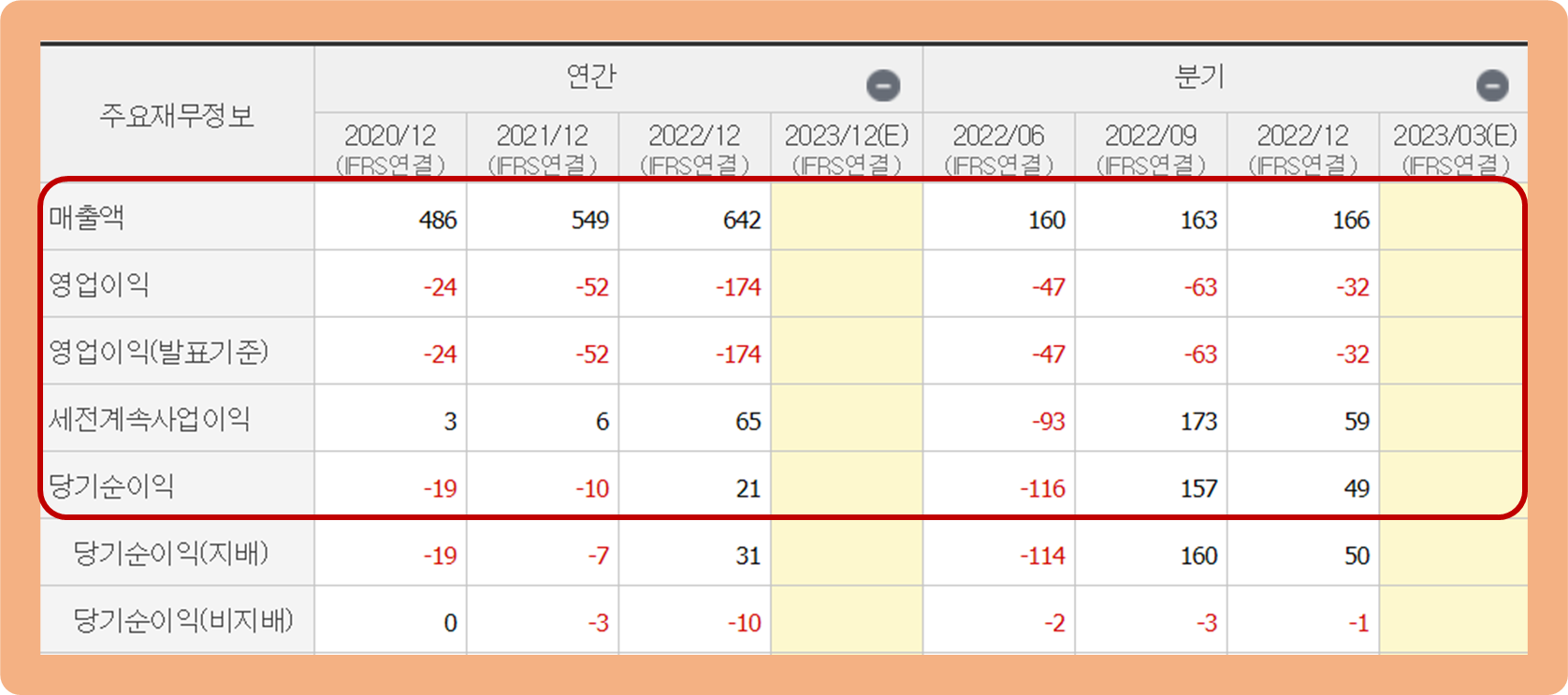 하지만 연간 영업이익은 2022년 기준 약 -174억원 손실을 기록하며 지난 수년 동안 적자 행진을 이어가고 있구요.