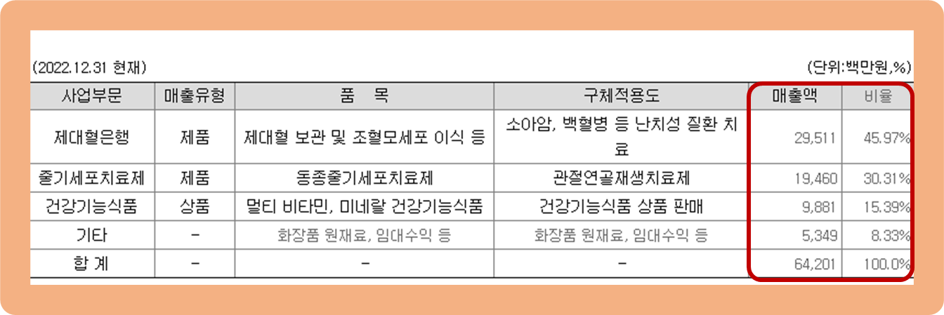 당사는 제대혈 보관, 줄기세포치료제 개발, 건강기능식품 판매업 등을 주력 사업으로 영위하고 있는 기업입니다.