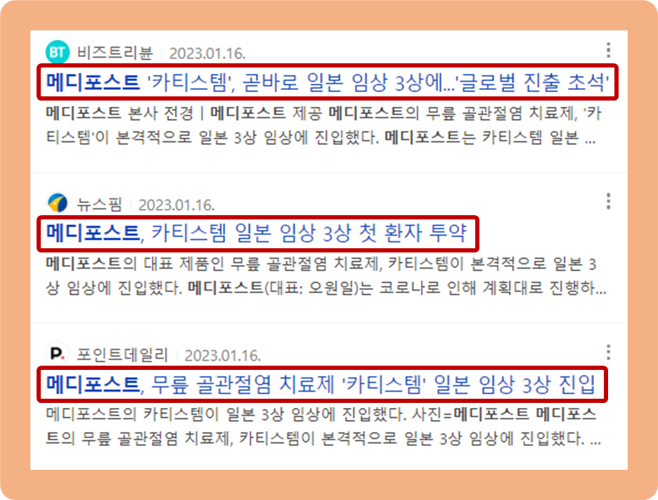 2023년 1월 16일, 당사가 무릎 골관절염 치료제인 "카티스템" 일본 진출을 위한 임상 3상 첫 번째 환자 투약을 완료했다는 소식을 발표했습니다.
