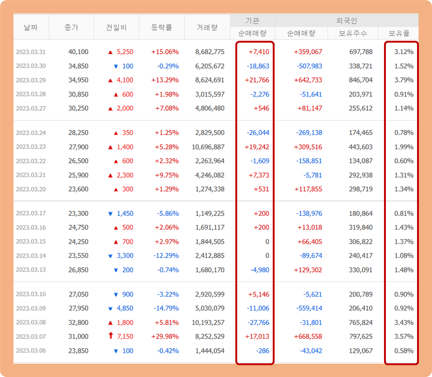 우선 기관투자자의 경우 지난 한달 간 매도세가 매수세에 비해 약간 더 우위를 점하고 있구요.