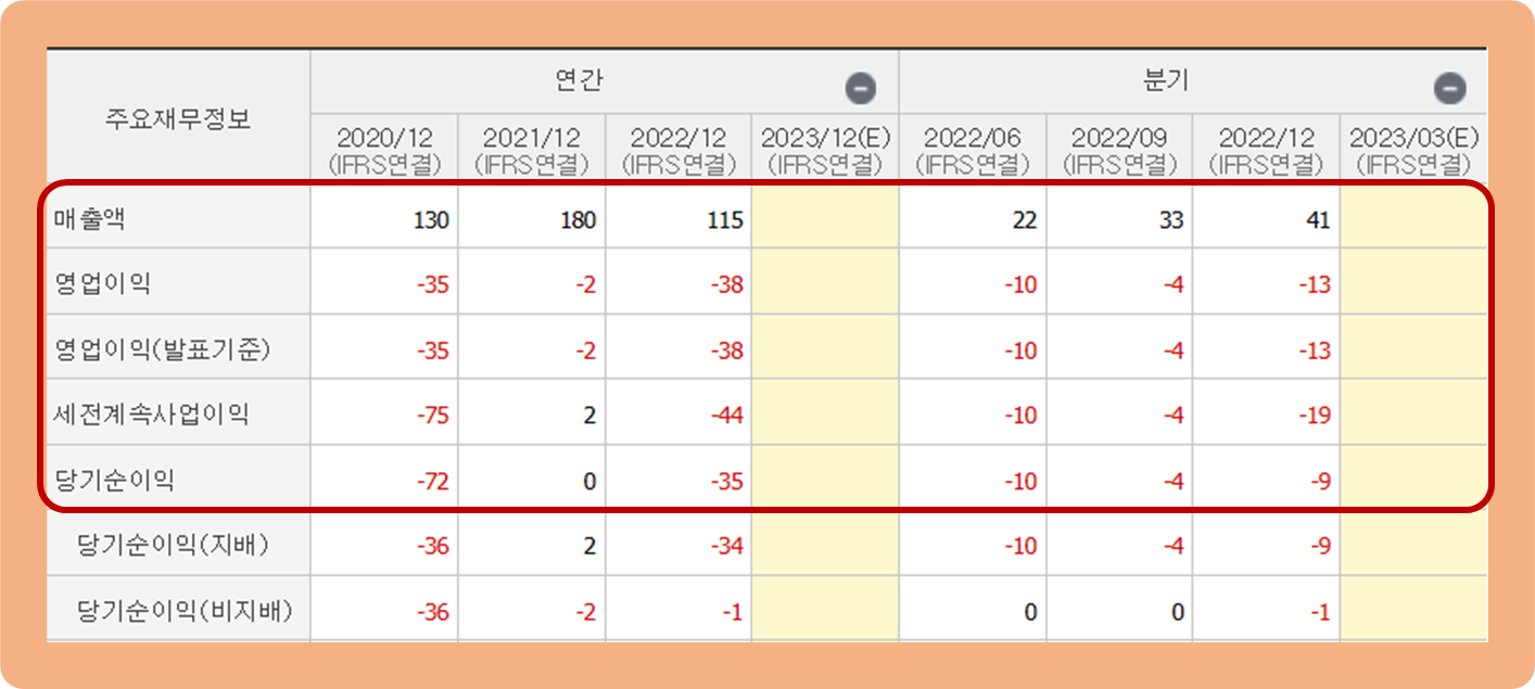 그리고 연간 영업이익은 2022년 기준 약 -38억원 손실을 기록하며 지난 수년 동안 계속해서 적자 행진을 이어가고 있구요.