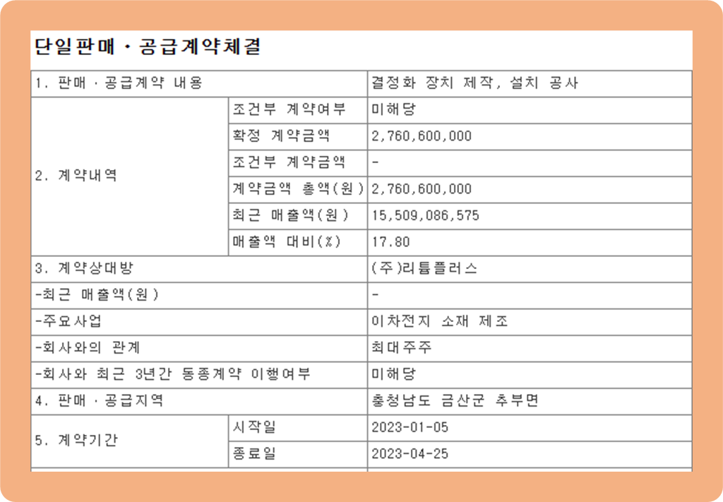 2023년 1월 6일, 하이드로리튬이 최대주주로 있는 리튬플러스와 약 28억원 규모의 결정화 장치 생산 및 설치 공사 계약을 맺었다는 내용의 공시를 발표했습니다.