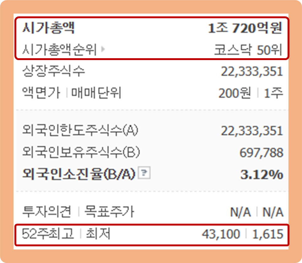 52주 최고가는 43,100원이며, 52주 최저가는 1,615원이네요.