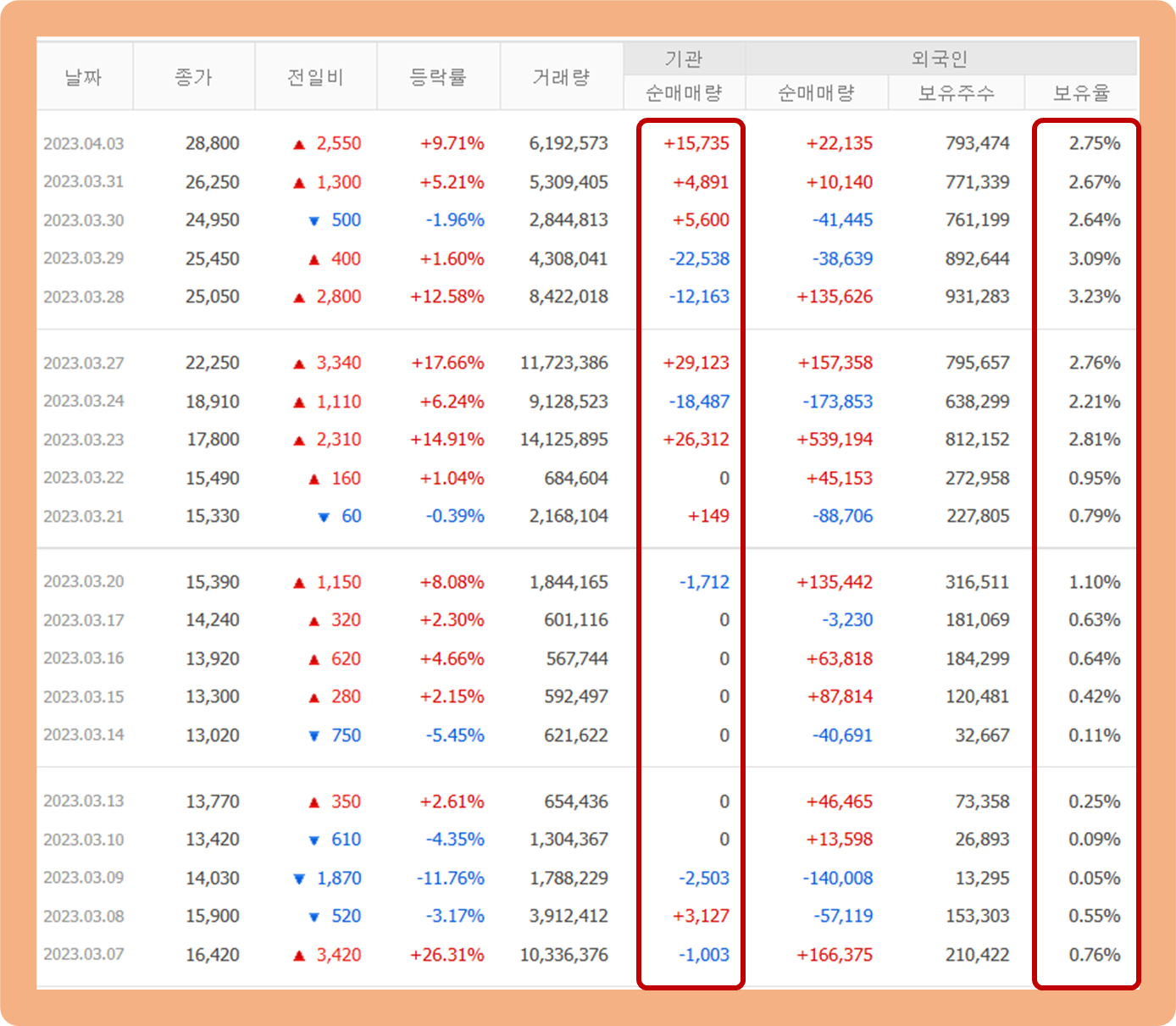 지난 한 달 간 기관투자자 및 외국인 주식 거래 추이에 대해 살펴보도록 하겠습니다.