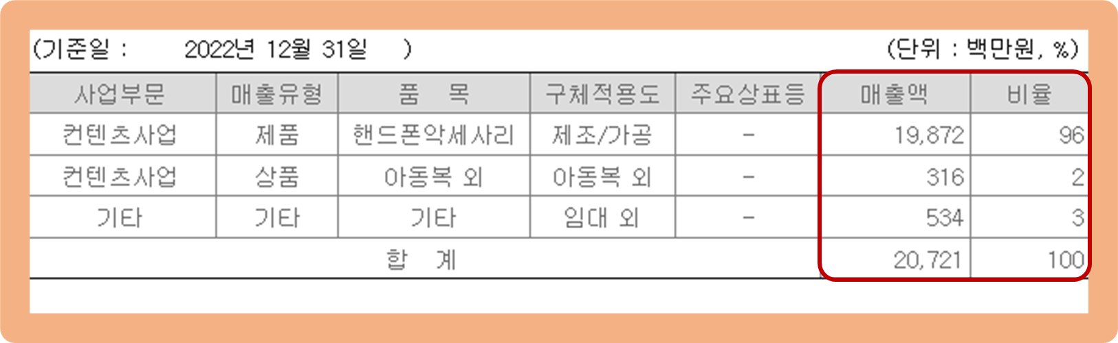 지난 2022년 12월 31일 기준 주요 제품별 매출 비중을 비교해보도록 하겠습니다.