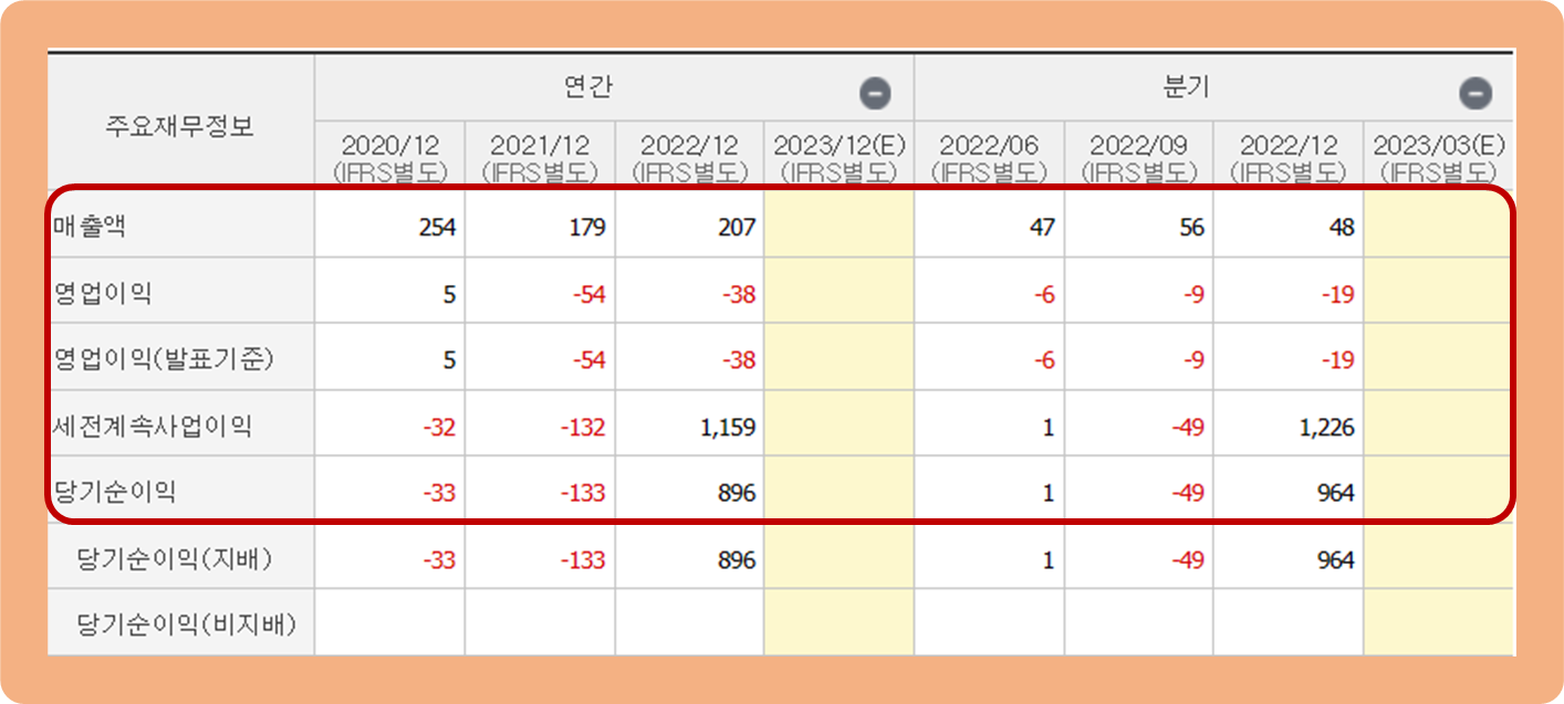 그리고 연간 영업이익은 2022년 기준 약 -38억원 손실을 기록하며 2년 연속 적자를 이어가고 있구요.