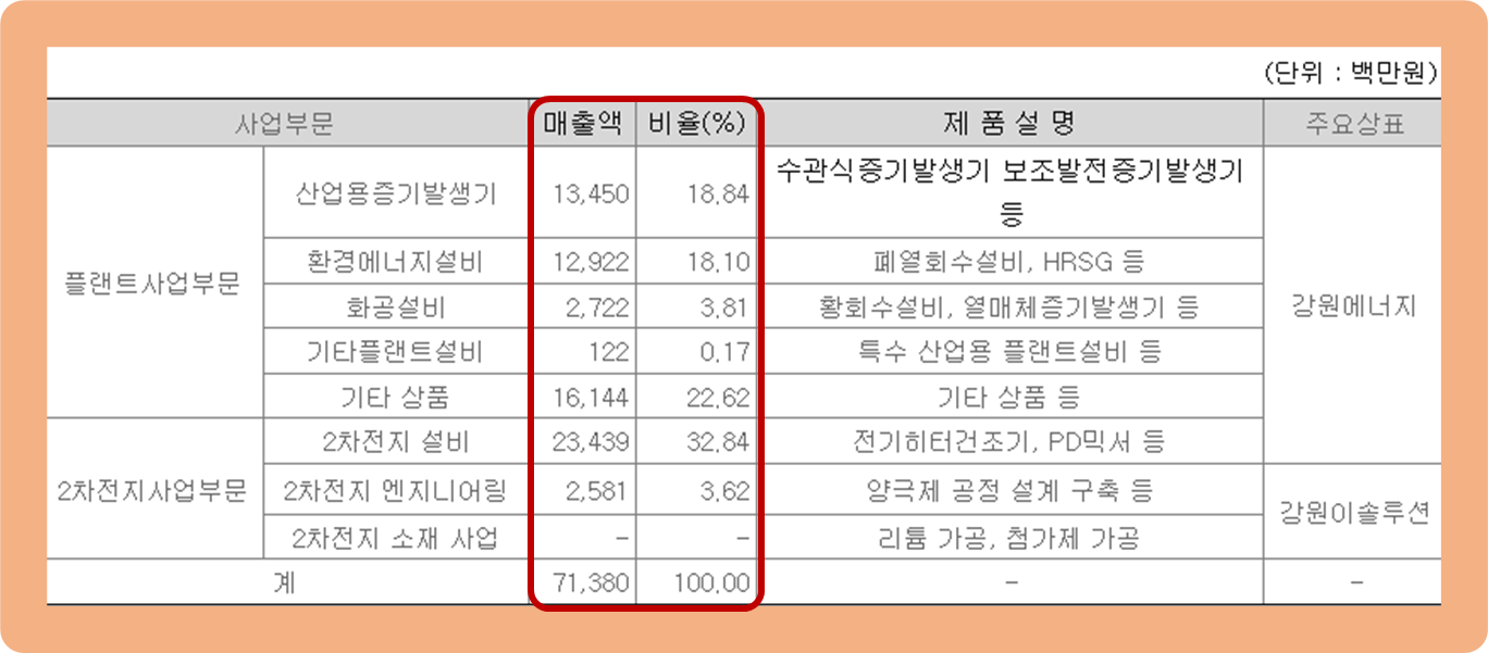 강원에너지 주가 전망, 주력 제품 매출 비중 비교