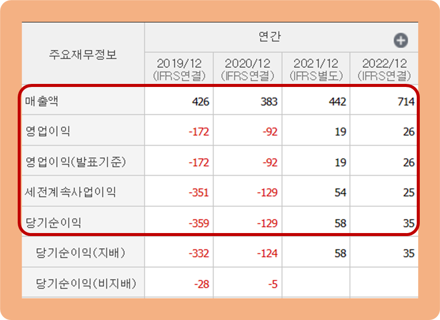 그리고 연간 당기순이익은 2022년 기준 약 35억원을 기록하며 전년 대비 약 40.7% 하락했네요.