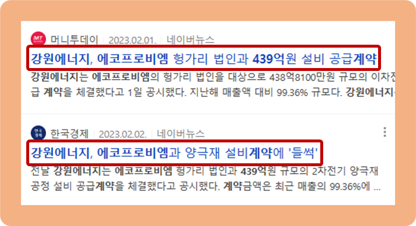2023년 2월 1일, 강원에너지가 에코프로비엠 헝가리 법인과 약 439억원 상당의 양극재 공정 설비 공급계약을 맺었다는 공시를 발표했습니다.
