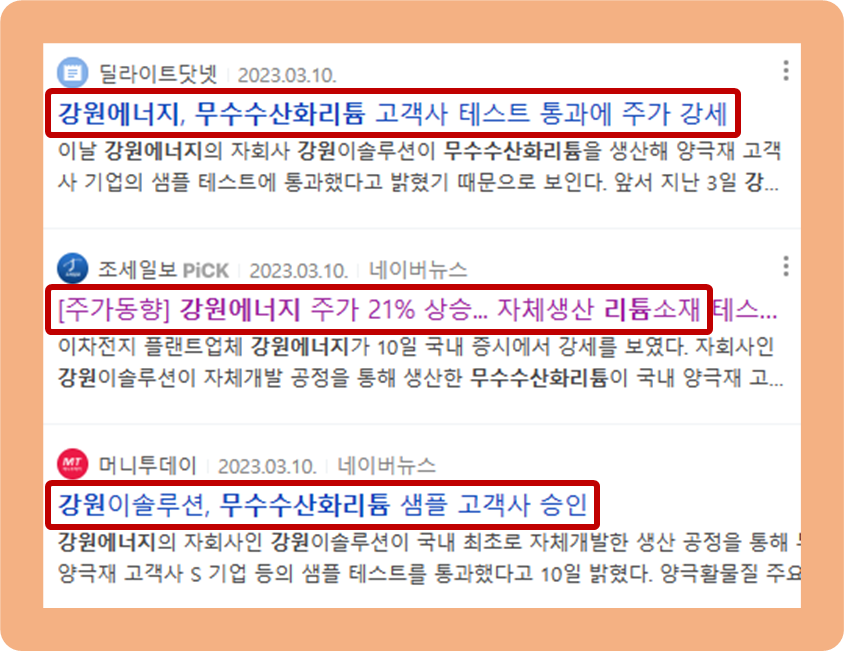 2023년 3월 10일, 강원에너지의 자회사인 강원이솔루션이 한국 최초로 자체개발한 생산 공정을 통해 무수수산화리튬을 생산하여 양극재 고객사의 샘플 테스트를 통과했습니다.