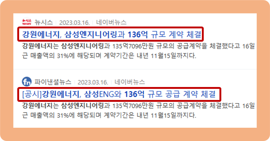다음 달인 2023년 3월 16일, 강원에너지가 삼성엔지니어링과 약 136억원 상당의 공급계약을 체결했다는 공시를 발표했습니다.
