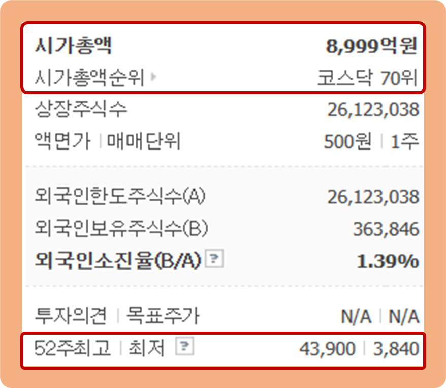 52주 최고가는 43,900원이며, 52주 최저가는 3,840원으로 최고가와 최저가 차이가 약 11배입니다.