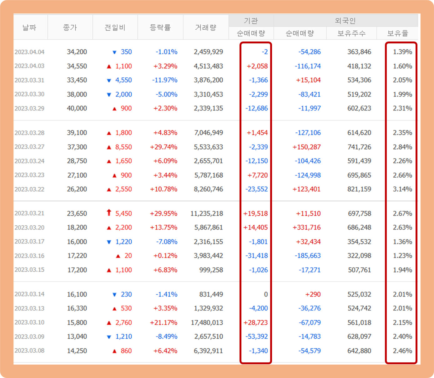 기관투자자의 경우 지난 한 달 간 매도세가 매수세에 비해 우위를 점하고 있습니다.