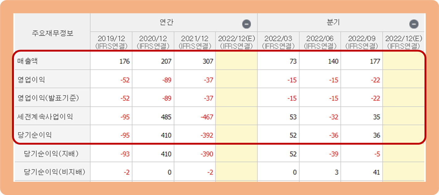 그리고 2022년 3분기 누적 영업이익은 약 -52억원 손실을 기록하며 지난 몇 년 동안 적자 행진이 지속되고 있구요.