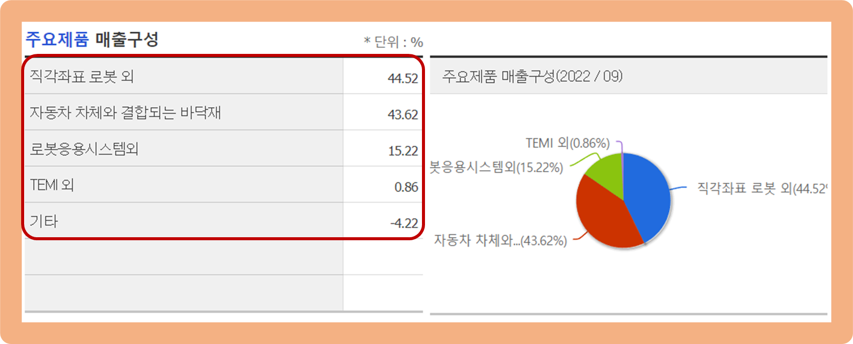 그 다음으로 자동차 차체와 결합되는 바닥재 부문 약 43.6%, 로봇응용시스템 부문 약 15.2%, TEMI 외 부문 약 0.9% 순이네요.