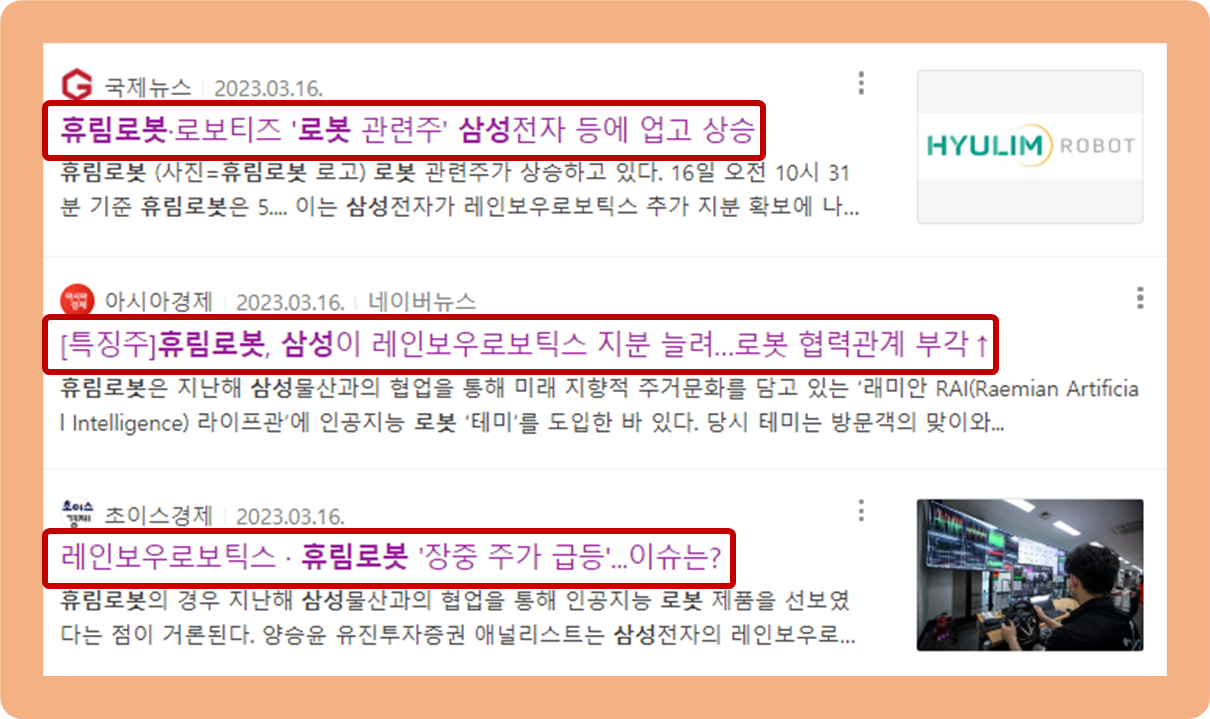 2023년 3월 16일, 삼성전자가 이 날 개장 전 레인보우로보틱스의 지분 약 4.77%를 1주당 3,400원에 장외 매수했다고 발표했습니다.