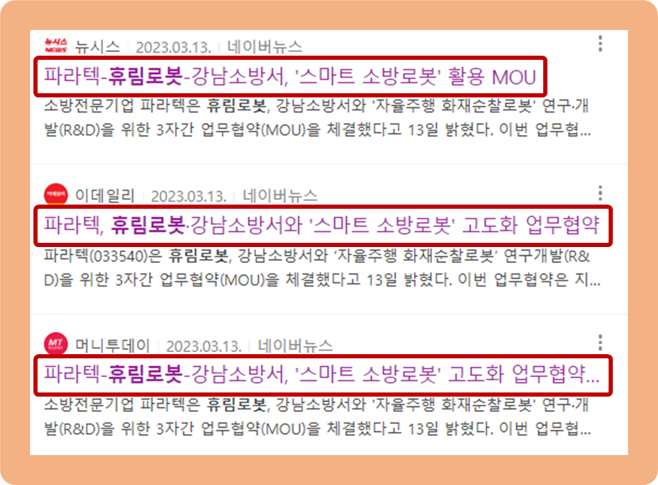 2023년 3월 13일, 휴림로봇, 파라텍, 강남소방서 3개 기업이 "자율주행 화재순찰로봇" 연구개발을 목적으로 한 3자간 MOU를 맺었습니다.