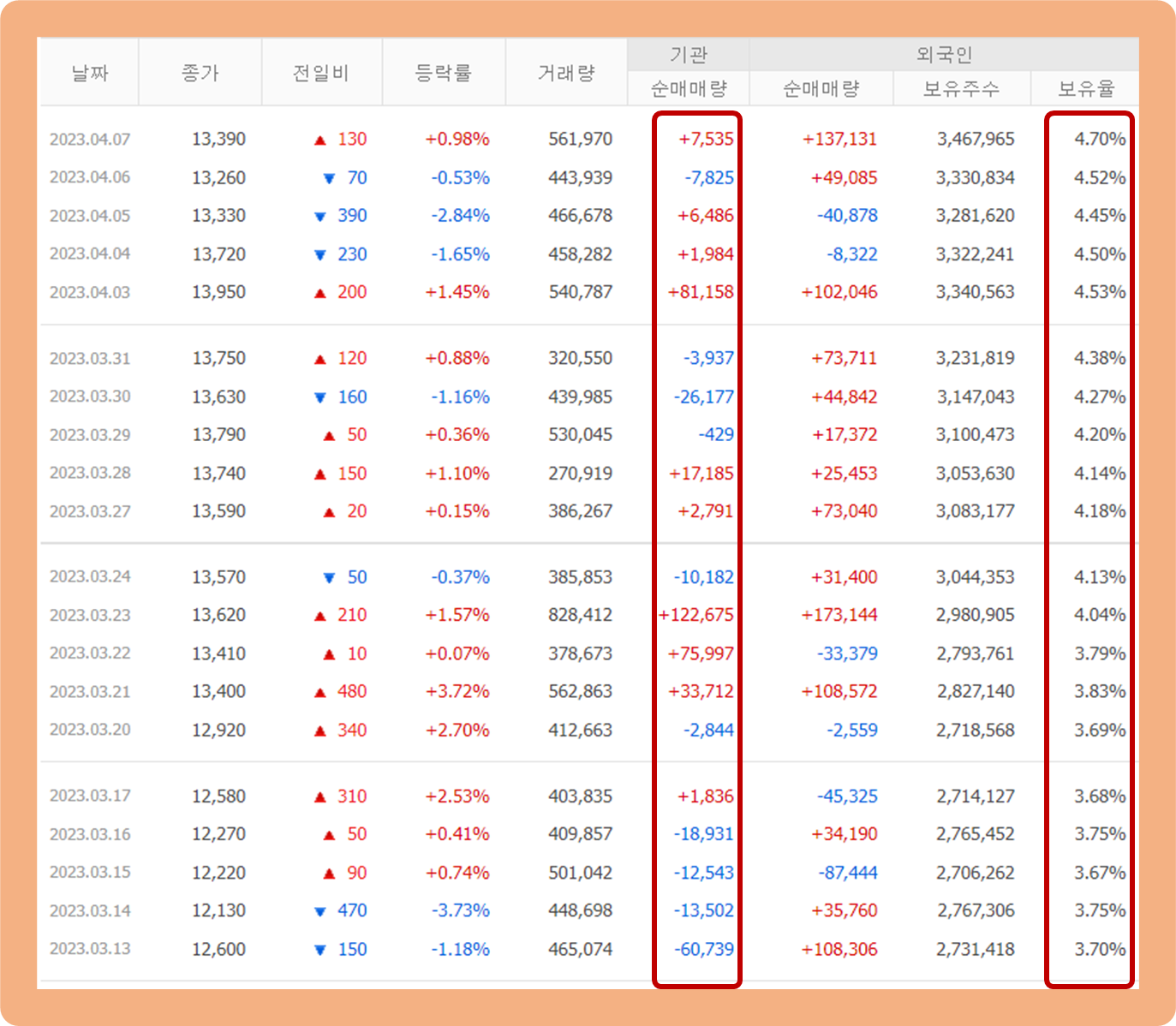 우선 기관투자자의 경우 지난 한 달 간 매수세가 매도세에 비해 조금 더 우위를 점하고 있구요.