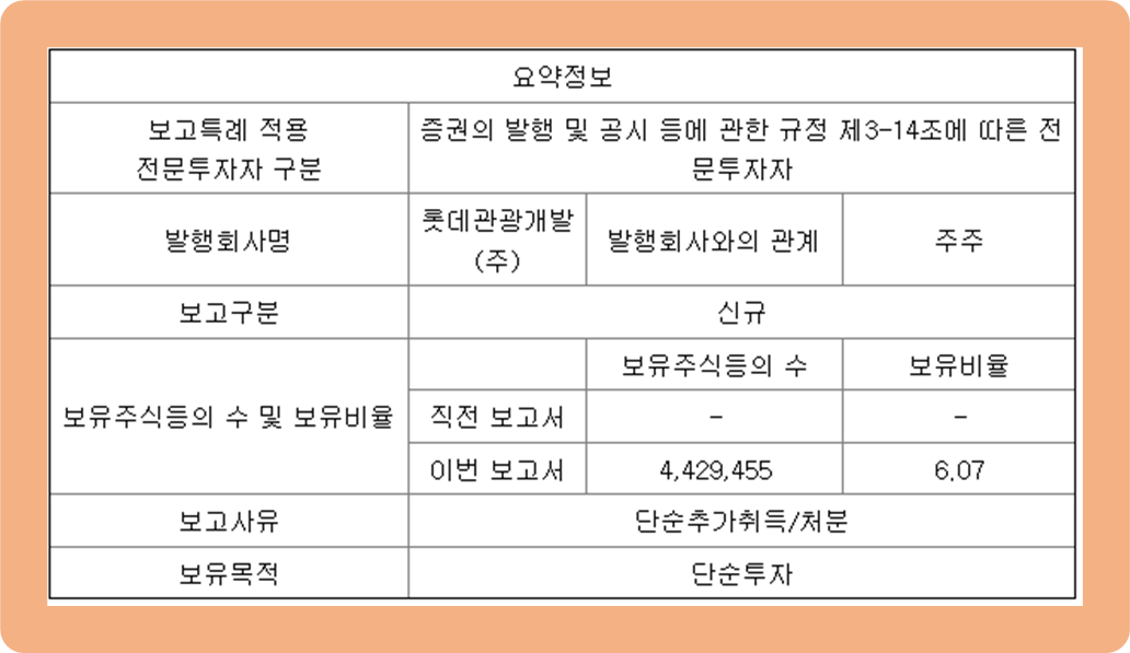 2023년 4월 6일, 롯데관광개발이 국민연금의 지분율이 기존 4.98%에서 1.09%(360만1,314주) 늘어난 6.07%(442만9455주)로 변경되었다는 소식을 발표했습니다.