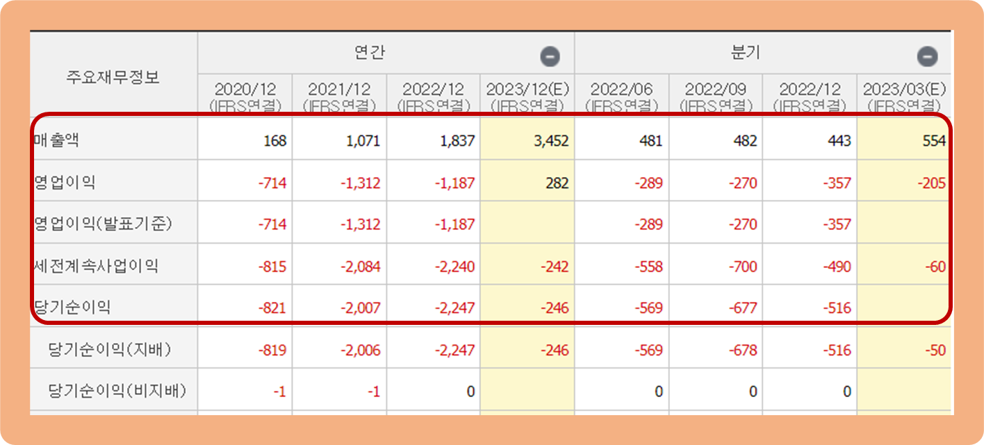 이와 반대로 연간 영업이익과 당기순이익은 2022년 기준 각 -1,187억원, -2,247억원 손실을 기록하며 지난 수 년 동안 계속해서 적자 행진을 이어오고 있네요.