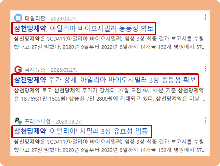 2023년 3월 24일, 삼천당제약이 신생혈관 연령 관련 항반변성 시험대상자를 대상으로 진행한 아일리아 바이오시밀러(SCD411)에 관한 글로벌 임상 3상을 실시한 결과, 안정성, 면역원성, 동등성 등을 입증했다는 내용의 공시를 발표했습니다.