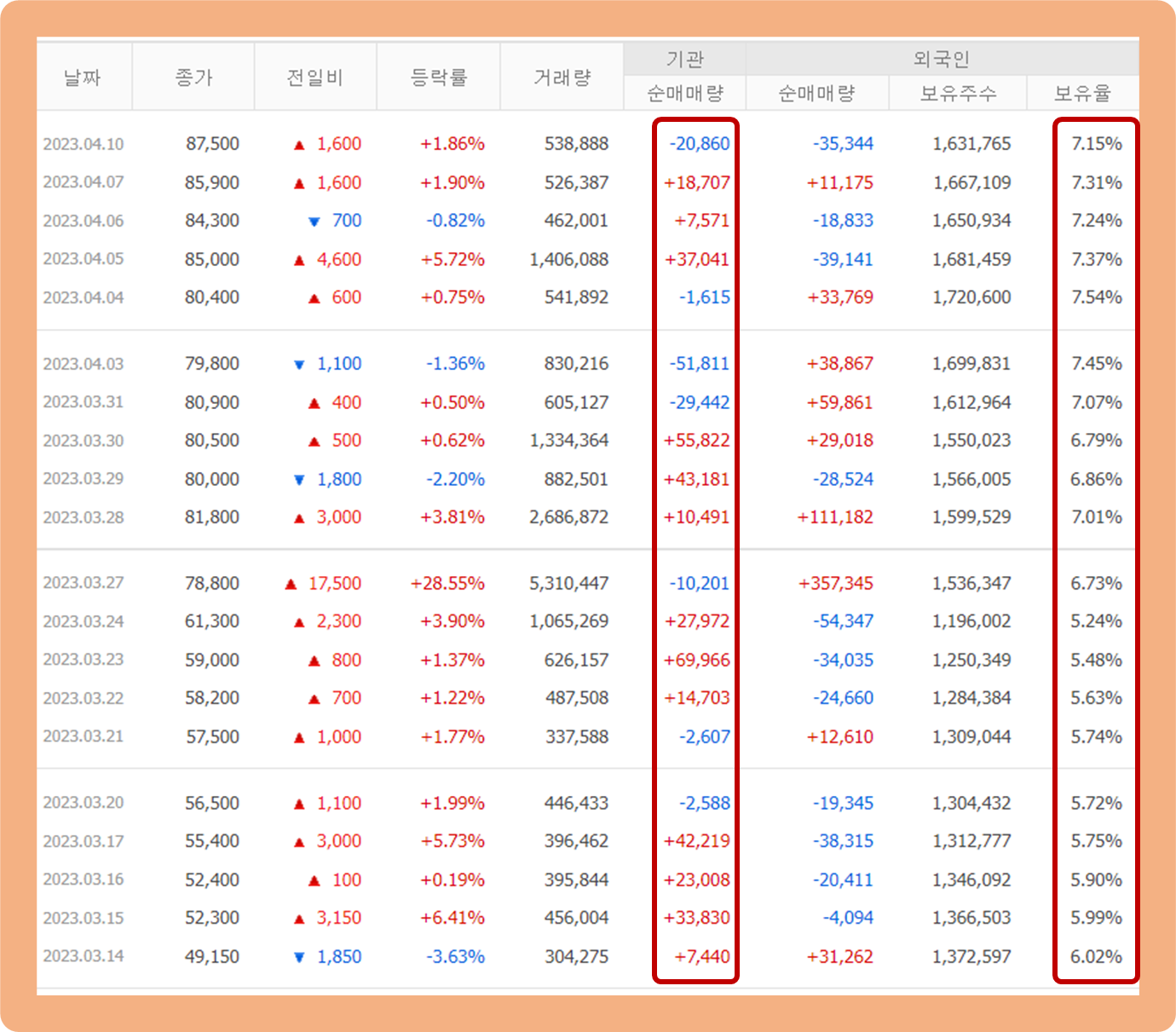지난 1개월 간 기관투자자 및 외국인투자자 주식 거래 동향에 대해 보도록 하겠습니다.
