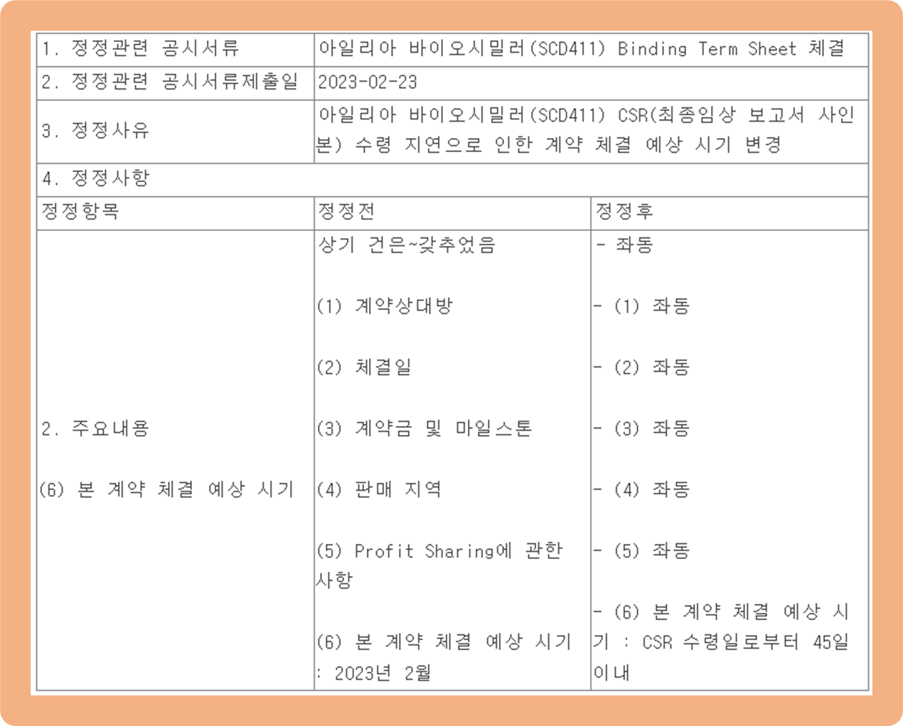 약 세달 뒤인 2023년 2월 23일, 아일리아 바이오시밀러(SCD411)의 CSR(최종임상 보고서 사인본) 수령 지연으로 인해 계약이 잠정적으로 연기되었다는 공시가 발표되었습니다.