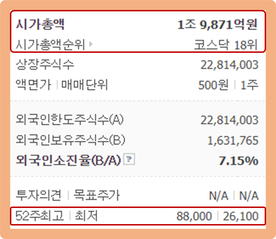 52추 최고가는 88,000원이며, 52주 최저가는 26,100원이네요.