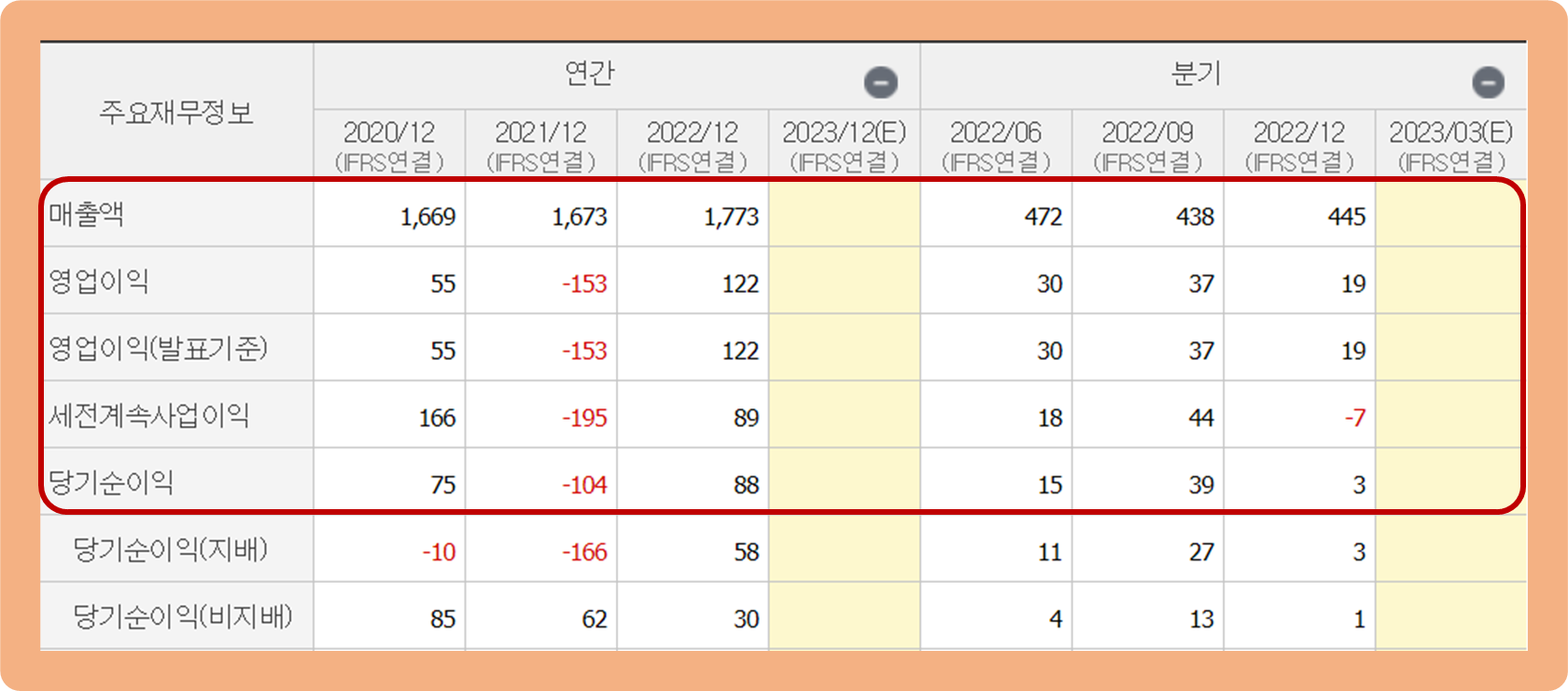 그리고 2022년 기준 연간 영업이익과 당기순이익은 각 122억원, 88억원을 기록하며 전년 대비 모두 흑자 전환에 성공했네요.