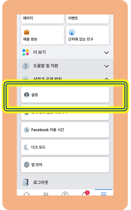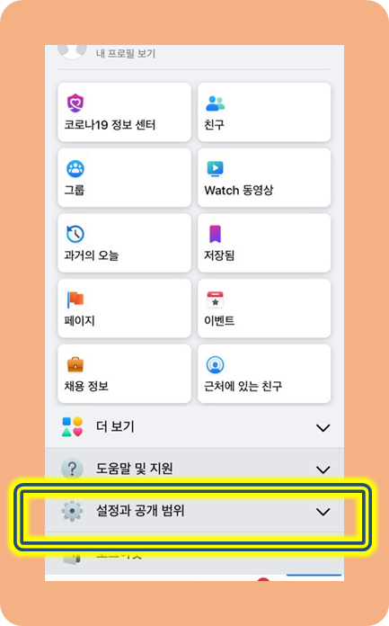 여기서 설정 및 공개 범위를 누릅니다.
