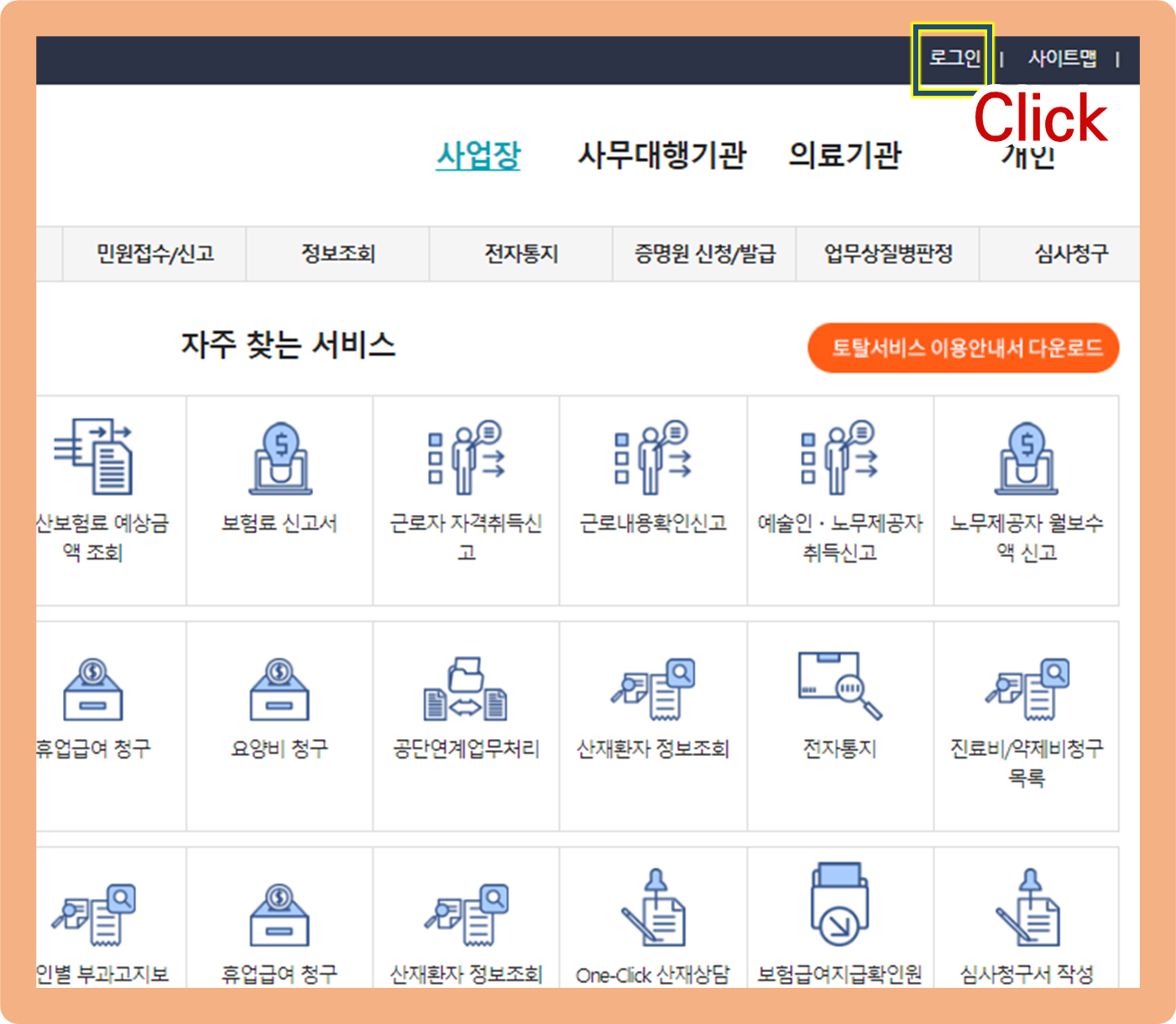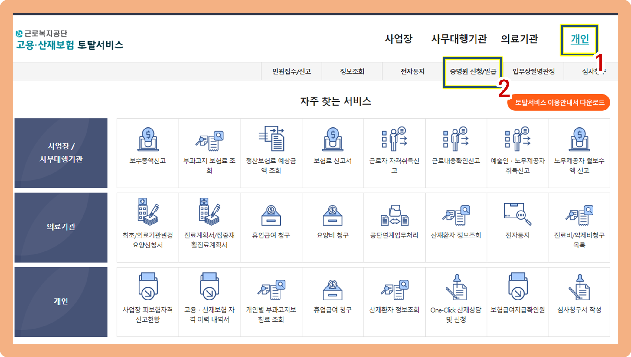 1. 온라인 : 근로복지공단 고용 및 산재보험 토탈서비스 이용.