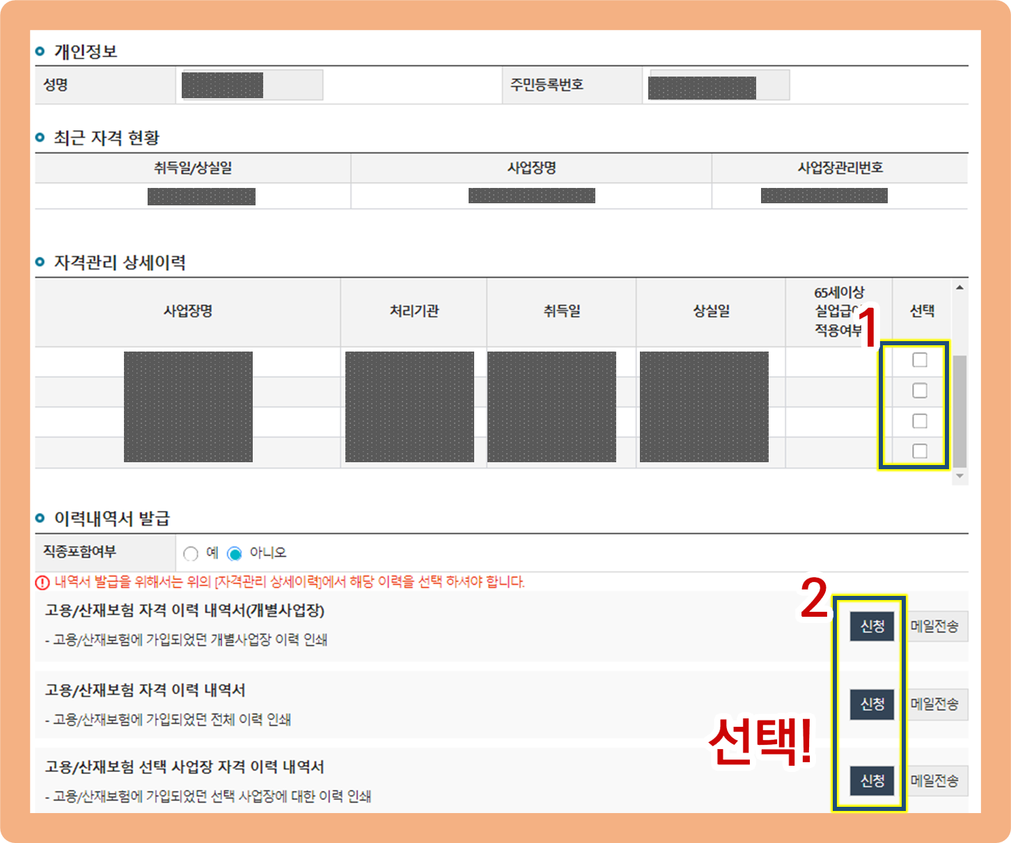 고용보험자격이력내역서 근로자용 발급 방법, 발급 원하는 이력 선택