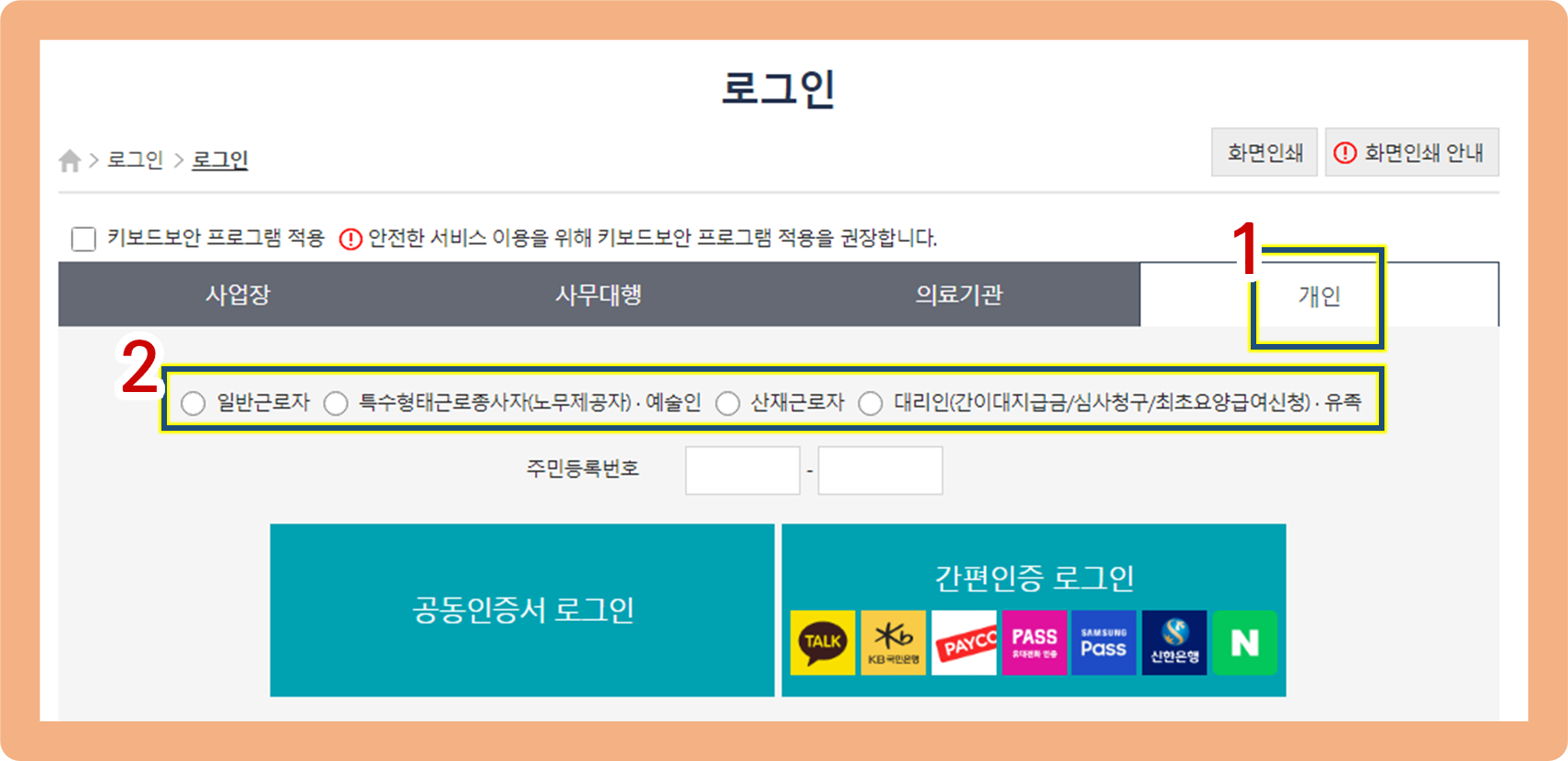 고용보험자격이력내역서 근로자용 발급 방법, 로그인 진행 2단계