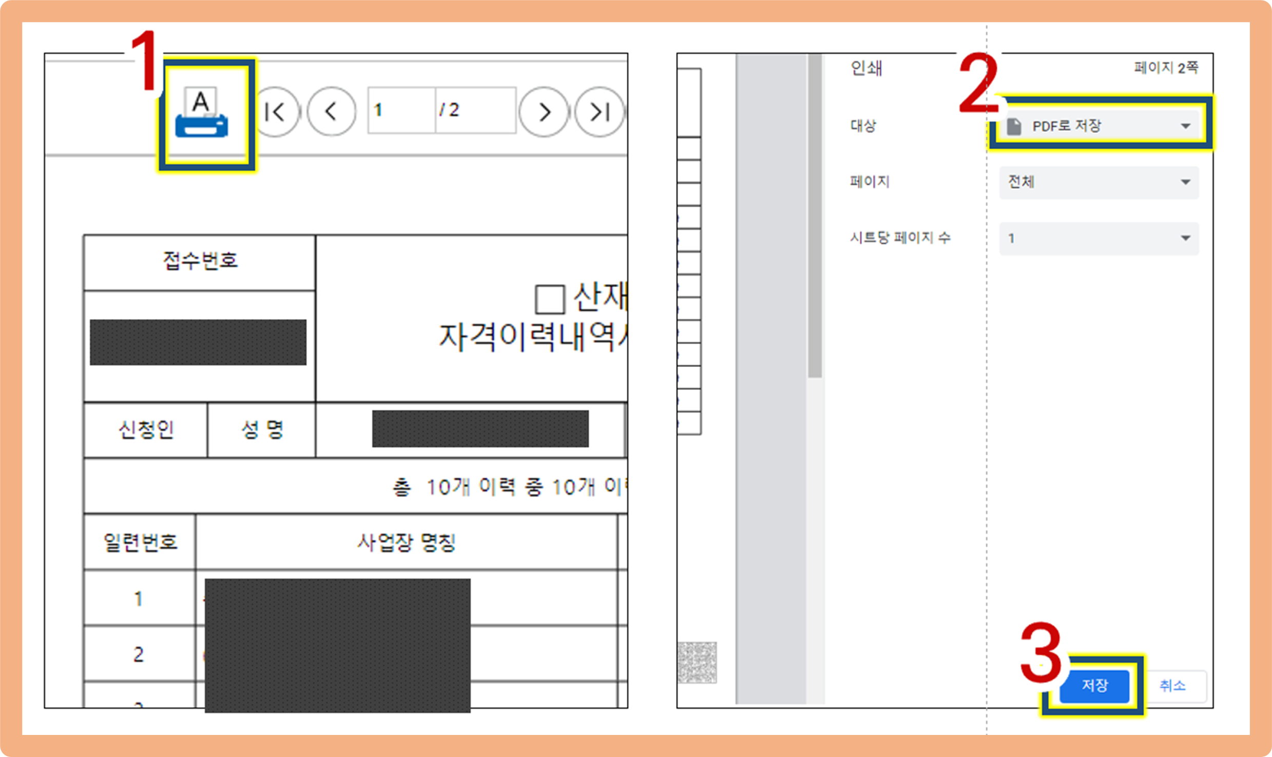 그 다음` PDF로 저장`을 선택하신 후 아래 `저장`을 눌러주시면 PDF 파일로 저장할 수 있게 됨. 끝.