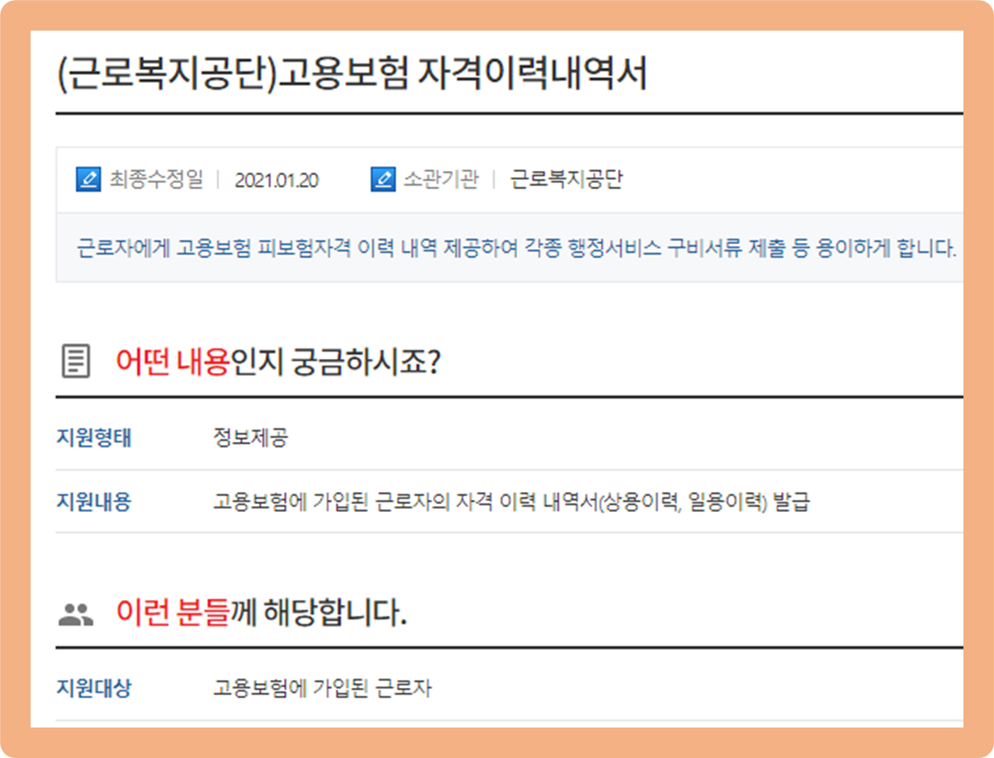 현재 고용보험에 가입되어 있으신 근로자분들의 경우 고용보험자격이력내역서를 발급받을 수 있습니다.