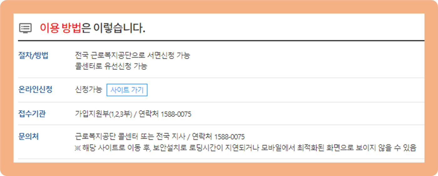 2. 오프라인 : 전국 근로복지공단 방문하여 신청 or 콜센터를 통한 유선 신청