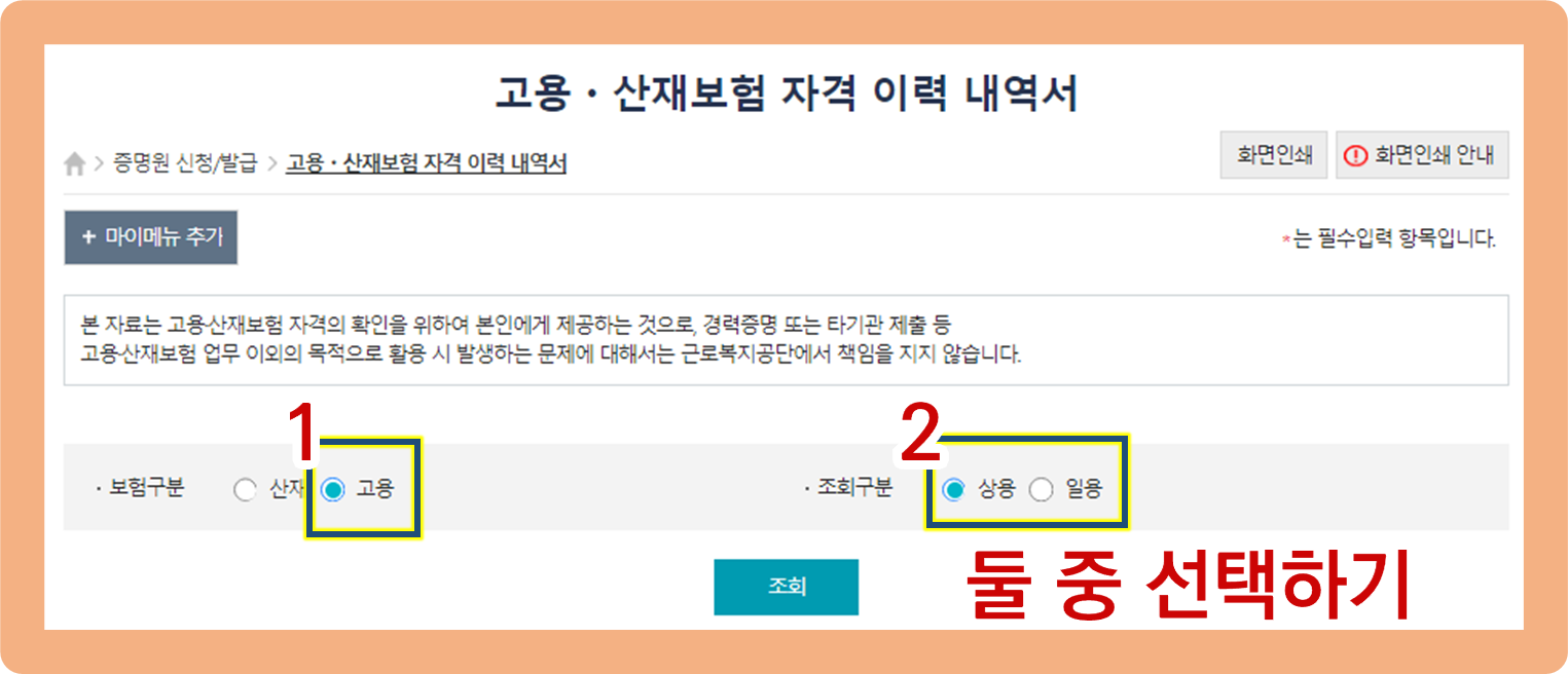 상용 이력 발급을 원하시는 분은 '상용'을 선택하시고, 일용 이력 발급을 원하시는 분은 '일용'을 선택해주시면 됨.