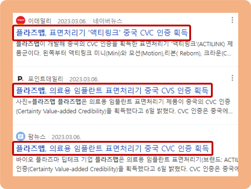 2023년 3월 6일, 플라즈마의 의료용 임플란트 표면처리기 제품이 중국의 CVC 인증을 획득했다는 소식이 발표되었습니다.