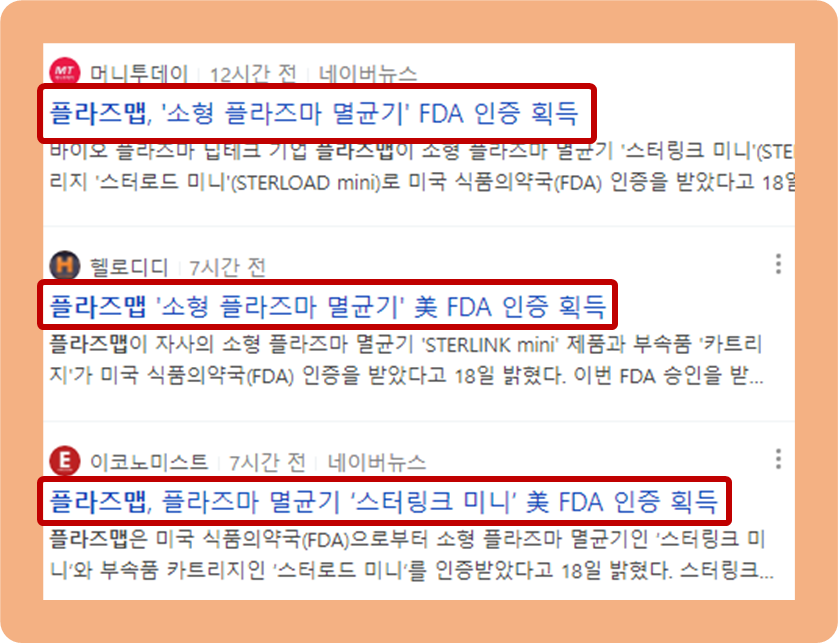 2023년 4월 18일, 플라즈맵의 스타링크 미니(소형 플라즈마 멸균기) 제품과 스터로드 미니(부속품 카트리지)가 미국 FDA 인증을 획득했다는 소식이 발표되었습니다.