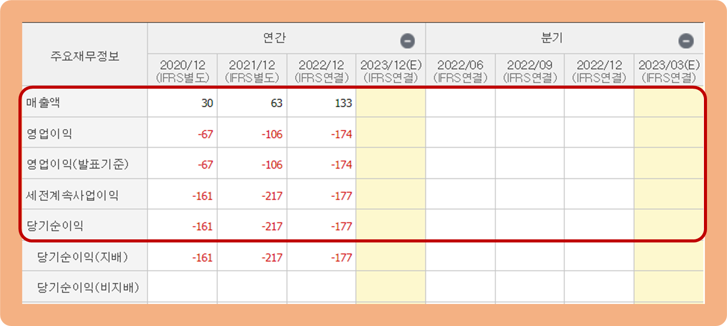 연간 영업이익과 당기순이익은 2022년 기준 각 -174억원, -177억원 손실을 기록하며 최근 수년 동안 계속해서 적자행진을 이어가고 있는 모습이네요.