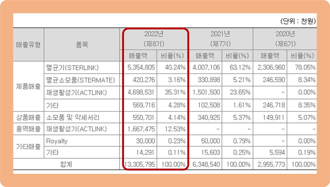 우선 멸균기, 멸균소모품, 재생활성기 등의 제품 매출 비중이 약 82.9%로 총 매출의 대부분을 책임지고 있구요.
