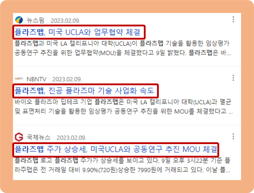 2023년 2월 9일, 플라즈맵과 UCLA(LA 캘리포니아 대학)이 멸균 및 표면처리 기술을 이용한 임상평가 공동연구 추진을 목적으로 한 업무 협약을 맺었습니다.