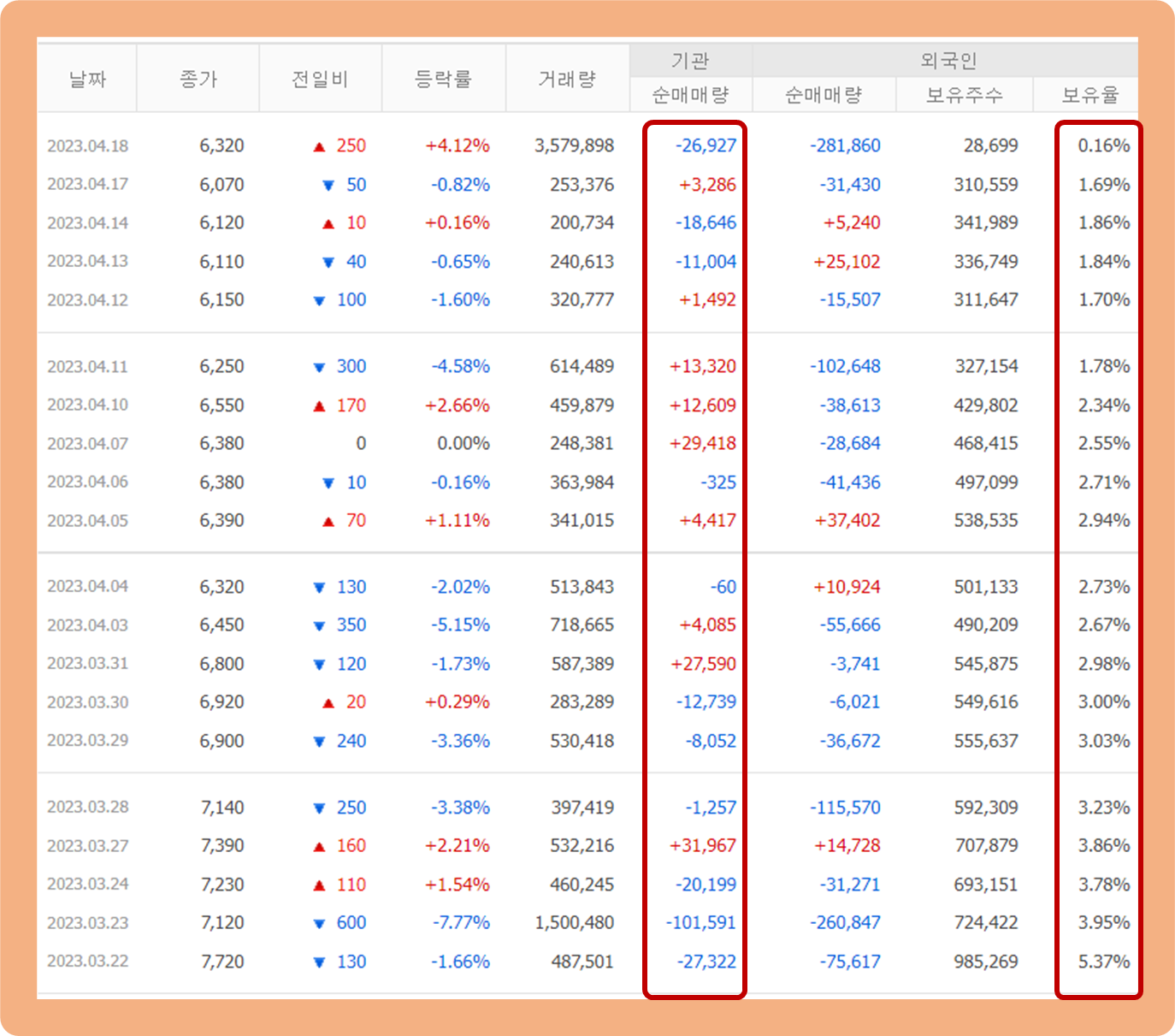 지난 1개월 간 기관 투자자 및 외국인 투자자 주식 거래 추이에 대해 살펴보겠습니다.