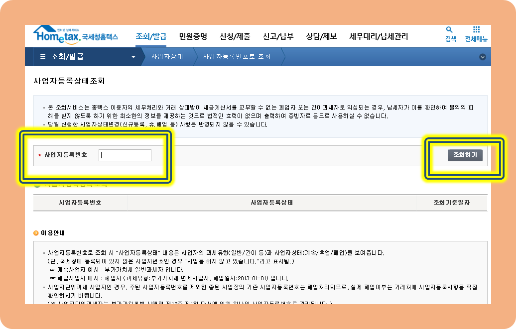 그러면 아래에 사업자등록번호로 조회라는 메뉴가 나옵니다.